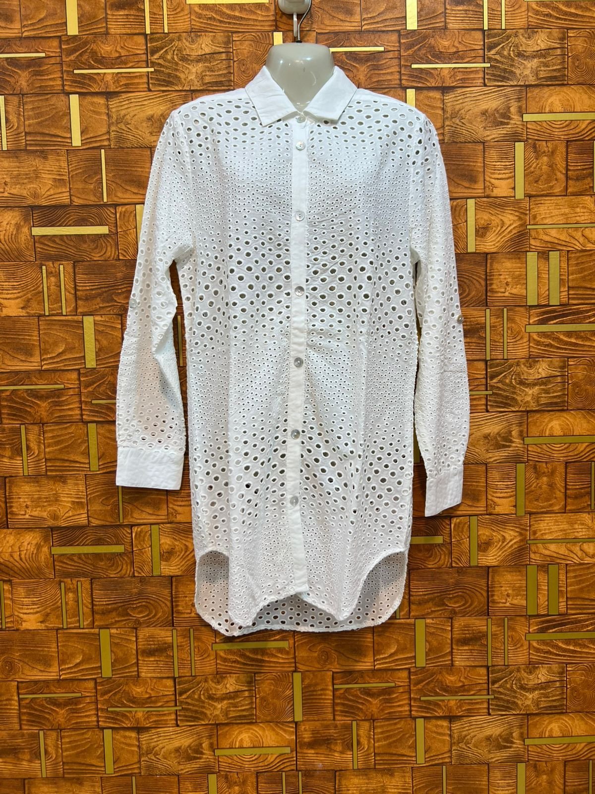 The Long Top in Medium Chikankari features intricate traditional embroidery on a 34-inch length and a 19-inch chest. The artisanal chikankari work adds a rich, tactile dimension to the fabric, making it a standout luxury piece. The narrow chest measurement ensures a tailored fit that highlights the beautiful craftsmanship of the embroidery.