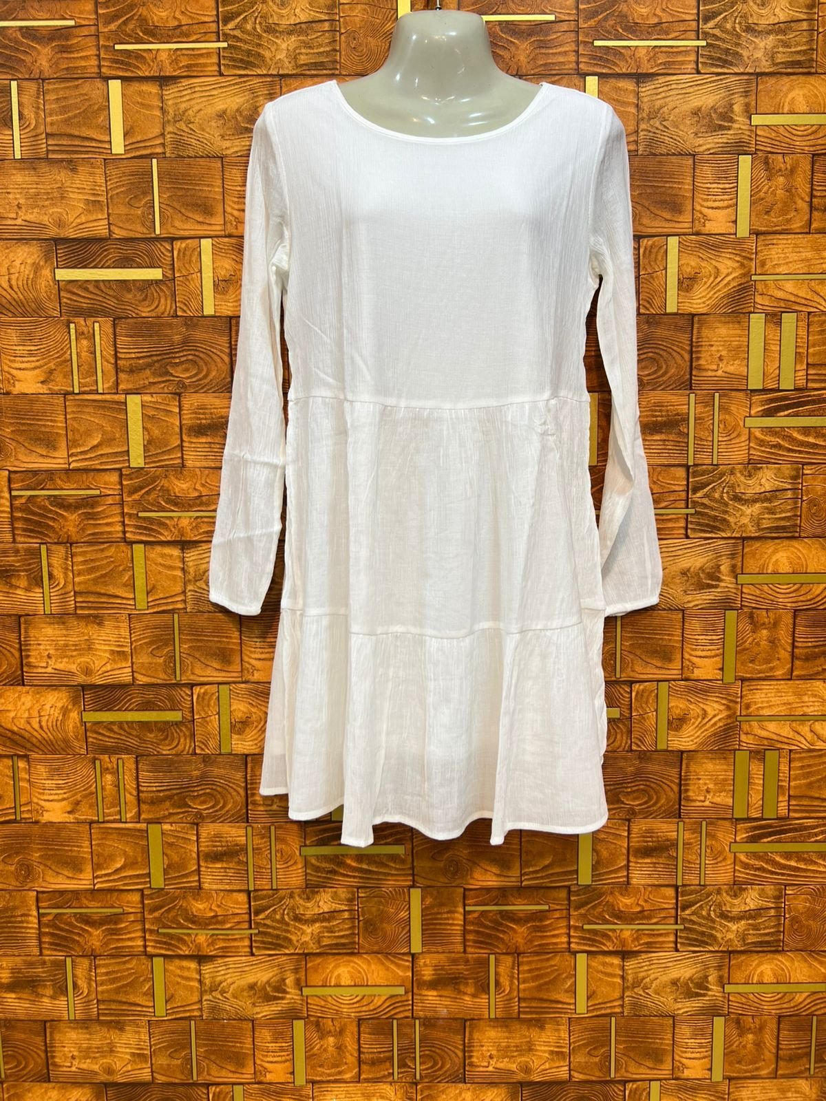 The Long Top in Small Chiffon is a versatile tunic with a 34-inch length and an 18-inch chest. The compact chest measurement ensures a neat fit, while the length provides ample coverage. This top is perfect for layering under shorter sweaters during transitional seasons to add a touch of length and texture.