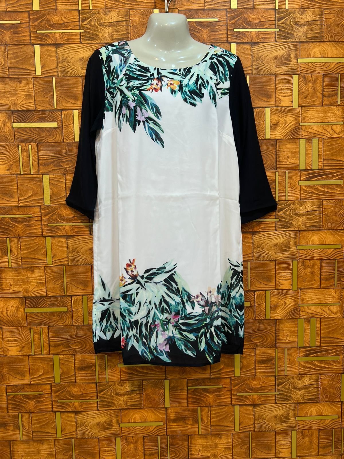 The Long Top in Small Chiffon measures 34 inches in length with a 19-inch chest, providing a balanced, mid-length tunic look. The lightweight nature of the chiffon allows it to be tucked in at the front for a “French tuck” style or worn loose for a breezy feel. It is a highly adaptable garment that serves as a core wardrobe staple.